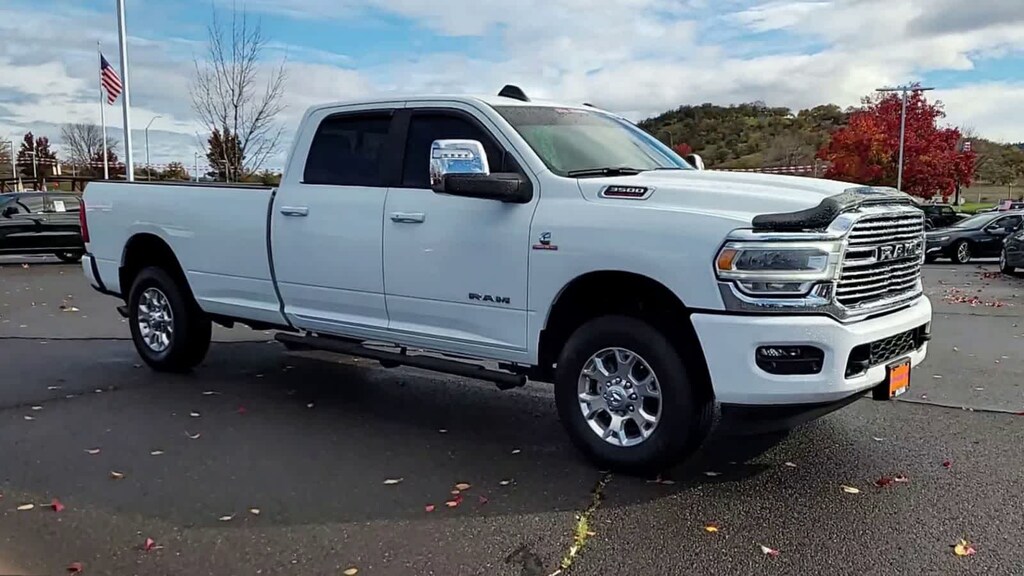 ENGINE: 6.7L I6 CUMMINS HO TURBO DIESEL Selective Catalytic Reduction (Urea), Dual 730 Amp Maintenance Free Batteries, Cummins Turbo Diesel Badge, Heavy Duty Engine Cooling, Supplemental Heater, 220 Amp Alternator, GVWR: 12,300 lbs, Current Generation Engine Controller, Diesel Exhaust Brake, Capless Fuel Fill w/o Discriminator, TRANSMISSION: 6-SPEED AUTOMATIC AISIN AS69RC HD Urethane Shift Control, Transmission Oil Cooler, LARAMIE LEVEL 1 EQUIPMENT GROUP Rear Window Defroster, Blind Spot & Cross Path Detection, Rain Sensitive Windshield Wipers, LED Tail Lamps, Power Adjustable Pedals w/Memory, Rear Power Sliding Window, 12 Touchscreen Display, Auto Power-Folding Mirrors, Auto Dimming Exterior Mirrors, Front LED Fog Lamps, LED Reflector Headlamps, Mirror Running Lights, Foam Bottle Insert (Door Trim Panel), Wheels: 18 x 8 Polished Aluminum, Forward & Reverse Utility Lights, Radio: Uconnect 5 Nav w/12.0 Display, Power Heat Fold Memory Telescopic Mirrors, Remote Tailgate Release, Auto High Beam Headlamp Control, Chrome Exterior Mirrors, Exterior Mirrors w/Memory, 2nd Row In Floor Storage Bins, Power Telescoping Mirrors, Auto Dimming Exterior Passenger Mirror, Auto Adjust In Reverse Exterior Mirrors. Ram Laramie with Bright White Clearcoat exterior and Black interior features a Straight 6 Cylinder Engine with 410 HP at 5600 RPM*.