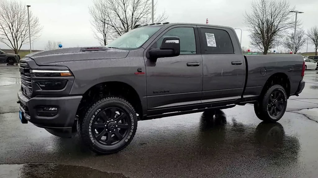 ENGINE: 6.7L I6 CUMMINS HO TURBO DIESEL Selective Catalytic Reduction (Urea), Dual 730 Amp Maintenance Free Batteries, GVWR: 11,800 lb, Cummins Turbo Diesel Badge, Heavy Duty Engine Cooling, Current Generation Engine Controller, Diesel Exhaust Brake, Supplemental Heater, 3.42 Axle Ratio, Front Bumper Sight Shields, Capless Fuel Fill w/o Discriminator, LARAMIE LEVEL 2 PLUS EQUIPMENT GROUP Power Adjustable Pedals w/Memory, For Details Visit DriveUconnect.com, For More Info, Call 800-643-2112, Power Deployable Running Boards, Drowsy Driver Detection, MOPAR Deployable Bed Step, Active Lane Management System, Remote Tailgate Release, 17 Speaker harman/kardon® Premium Sound, 2nd Row In Floor Storage Bins, CTR Stop Lamp w/Cargo View Camera, Rain Sensitive Windshield Wipers, LED Bed Lighting, Traffic Sign Recognition, Adaptive Steering System, Auto Dimming Exterior Mirrors, Foam Bottle Insert (Door Trim Panel), 14.4 Touchscreen Display, Power Heat Fold Memory Telescopic Mirrors, Radio: Uconnect 5 Nav w/14.4 Display, MOPAR Spray In Bedliner, Auto High Beam Headlamp Control, Exterior Mirrors w/Memory, Auto Dimming Exterior Passenger Mirror, Auto, NIGHT EDITION Firestone Brand Tires, Tires: LT285/60R20E OWL On/Off Road, Black Exterior Truck Badging, Wheels: 20 x 8.0 Black Painted Aluminum, Gloss Black Grille Billets/Accents, Body Color Grille Surround, Sport Performance Hood, Black Exterior Mirrors, TRANSMISSION: 8-SPEED TORQUEFLITE HD AUTOMATIC 12.0 Single Rear Wheel Axle, BLACK, LEATHER TRIMMED BUCKET SEATS Bucket Seats, Dual Wireless Charging Pad, Ventilated Front Seats, Radio/Driver Seat/Mirrors/Pedals Memory, Full Length Upgraded Floor Console. Ram Laramie with Granite Crystal Metallic Clearcoat exterior and Black interior features a Straight 6 Cylinder Engine with 430 HP at 2800 RPM*.