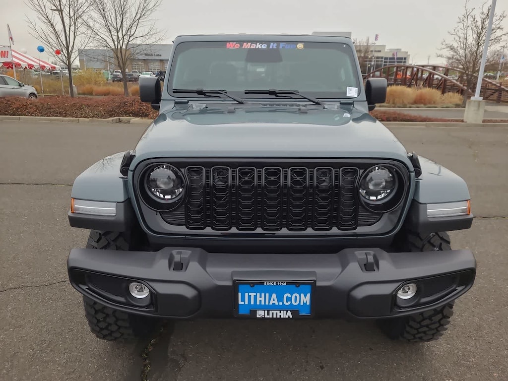 QUICK ORDER PACKAGE 24W WILLYS 3.6L V6 24V VVT UPG I Engine w/ESS, 8-Speed Automatic 850RE Transmission, LED Taillamps, Protection Sill Rails, 4-Wheel Drive Decal, Black Grille, Body Color Fender Flares (2-Piece), Front Heavy Duty Red Accent Shock Absorbers, Daytime Running Lamps LED Accents, Front LED Fog Lamps, LED Premium Reflector Headlamps, E-Locker Rear Axle, Corning Gorilla Glass, Trailer Hitch Zoom, Class IV Receiver Hitch, Security Alarm, Mold In Color Bumper w/Gloss Black, Advanced Brake Assist, Heavy Duty Engine Cooling, Automatic Headlamps, Air Conditioning w/Auto Temp Control, Deep Tint Sunscreen Windows, Off-Road Plus Mode, Willys Hood Decal, Full Speed Forward Collision Warning Plus, Rear Heavy Duty Red Accent Shock Absorbers, Front Door Locks 2-Door Passive Entry, Cluster, BLACK 3-PIECE HARD TOP Freedom Panel Storage Bag, Rear Window Defroster, Rear Sliding Window, CONVENIENCE GROUP Emergency/Assistance Call, Front Door Locks 2-Door Passive Entry, Remote Start System, Body Color Fender Flares (2-Piece), Cluster 7.0 TFT Color Display, Universal Garage Door Opener, Daytime Running Lamp System, Heated Front Seats, Air Conditioning w/Auto Temp Control, Heated Steering Wheel, Corning Gorilla Glass, ALPINE PREMIUM AUDIO SYSTEM, MOPAR SPRAY IN BEDLINER, 8-SPEED AUTOMATIC 850RE TRANSMISSION (STD), 3.6L V6 24V VVT UPG I ENGINE W/ESS (STD). Jeep Willys with Anvil Clearcoat exterior and Black interior features a V6 Cylinder Engine with 285 HP at 6400 RPM*.
