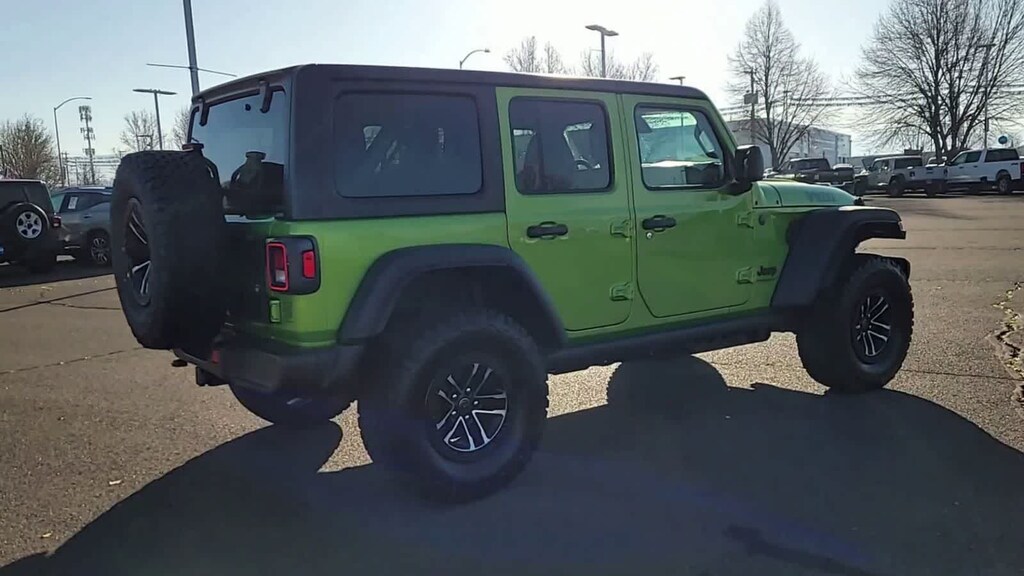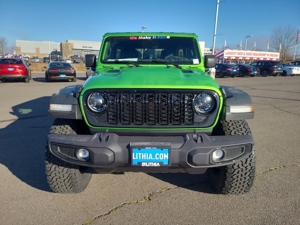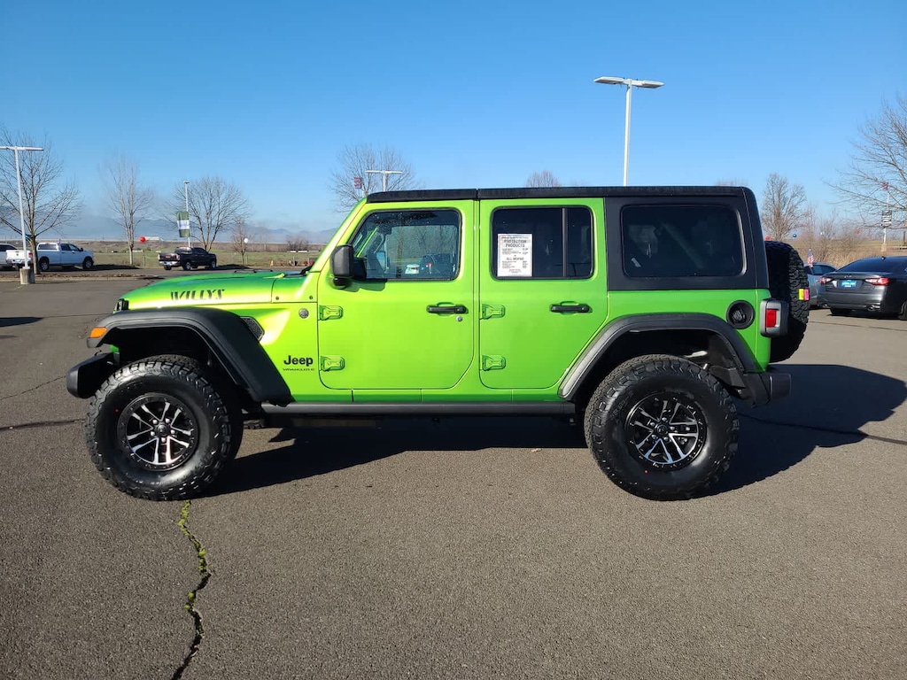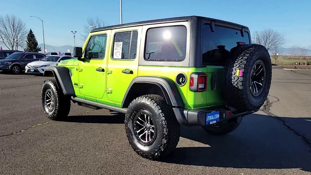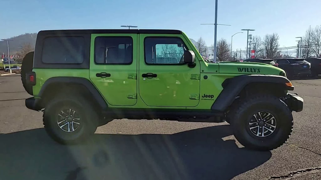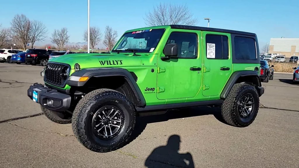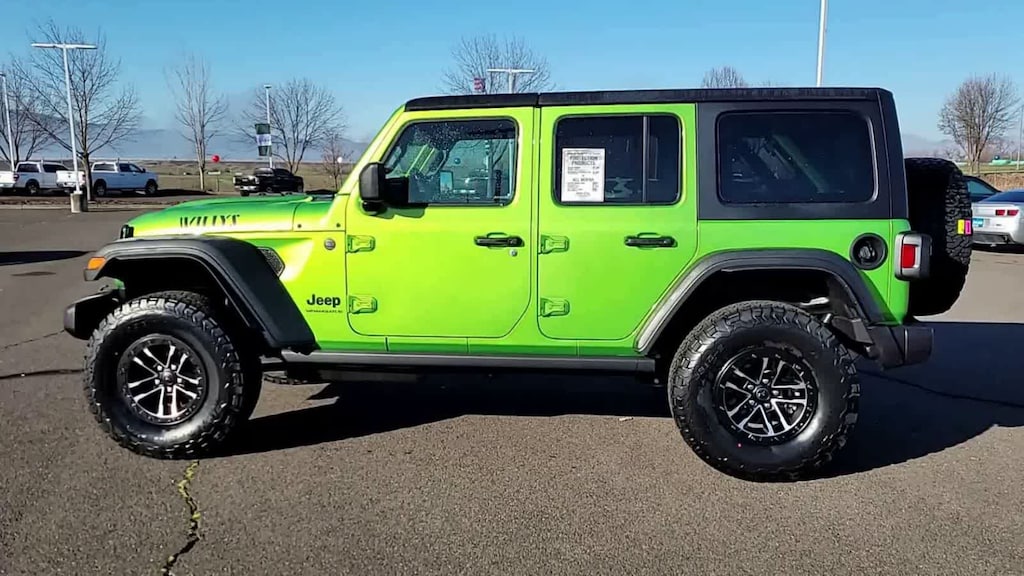 QUICK ORDER PACKAGE 24W WILLYS 3.6L V6 24V VVT UPG I Engine w/ESS, 8-Speed Automatic 850RE Transmission, 7 & 4 Pin Wiring Harness, Conventional Differential Front Axle, 4-Wheel Drive Swing Gate Decal, Black Grille, Injection Molded Black Rear Bumper, Dana M210 Wide HD Tube Front Axle, Daytime Running Lamps LED Accents, Front LED Fog Lamps, LED Premium Reflector Headlamps, E-Locker Rear Axle, Corning Gorilla Glass, Security Alarm, Class II Receiver Hitch, Mold In Color Bumper w/Gloss Black, Advanced Brake Assist, Automatic Headlamps, Off-Road Plus Mode, Willys Hood Decal, Full Speed Forward Collision Warning Plus, Rock Protection Sill Rails, Power Heated Mirrors, Enhanced Adaptive Cruise Control, Auxiliary Switches, Dana M220 Wide Rear Axle, Molded in Color Rubicon Highline Flare, Premium, 8-SPEED AUTOMATIC 850RE TRANSMISSION Adaptive Cruise Control w/Stop, Anti-Lock 4-Wheel Disc Brakes, Integrated Radar Camera Module (IRCM), Dana M200 Rear Axle, Selec-Speed Control, XTREME 35 TIRE PACKAGE LT315/70R17C 113/110S Tires, Wheel Flare Extensions, MOPAR Tire Relocation Kit, Anti-Lock 4-Wheel Disc Perf Brakes, 17 x 8 Machined Wheels w/Black Pockets, 4.56 Rear Axle Ratio, Injection Molded Black Rear Bumper, 35 Tire Suspension, MOPAR Hinge-Gate Reinforcement, Delete 4-Wheel Drive Swing Gate Decal, MOPAR Jack Spacer, Molded in Color Rubicon Highline Flare, 6,250 lbs GVWR, BLACK 3-PIECE HARD TOP Freedom Panel Storage Bag, Rear Window Defroster, Rear Window Wiper/Washer, CONVENIENCE GROUP Emergency/Assistance Call, 2-Door Passive Entry, Front Door Locks, Cluster 7.0 TFT Color Display, Universal Garage Door Opener, Heated Front Seats, Air Conditioning w/Auto Temp Control, Heated Steering Wheel, Air Filtering, ALPINE PREMIUM AUDIO SYSTEM, 3.6L V6 24V VVT UPG I ENGINE W/ESS Engine Oil Cooler (STD). Jeep Willys with Mojito Clearcoat exterior and Black interior features a V6 Cylinder Engine with 285 HP at 6400 RPM*.