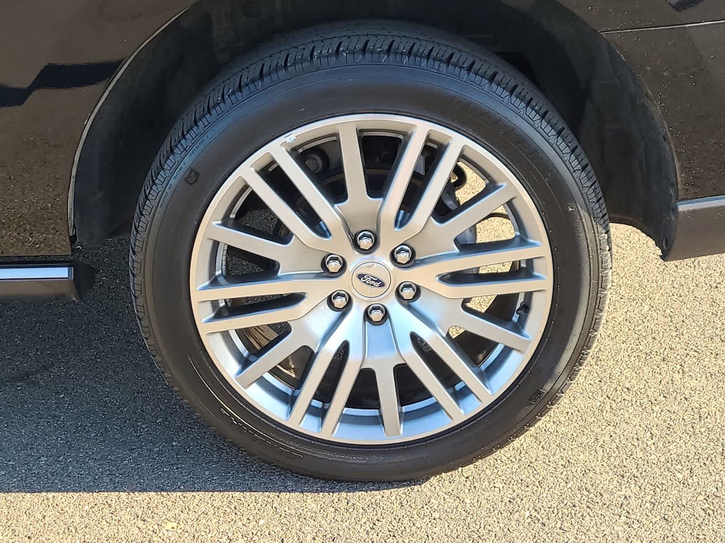 EQUIPMENT GROUP 302A HIGH PACKAGE Wheels: 22 12-Spoke Polished Aluminum, Ebony Black Mesh Grille, bright chrome bars and chrome inserts, Power-Folding Sideview Mirrors w/Autofold, power and heated glass, turn signal indicators, security approach lamps, driver/passenger side memory and body-color caps, Ford Co-Pilot360 Assist 2.0, Connected Navigation, 1 year of connectivity, pinch-to-zoom capability, live traffic, predictive destinations and route guidance, Reverse Brake Assist, 360-Degree Camera w/Split View, front/rear washer, Magnetic-Painted Power Deployable Running Boards, polished stainless accent, Panoramic Vista Roof, power open/close w/power shade, Heavy-Duty Independent Suspension, Tires: P285/45R22 110H AS BSW, 2ND ROW POWER-FOLDING 40/20/40 LEATHER BENCH SEAT 8-passenger seating, tip-and-slide feature, ADVANCED CARGO MANAGER black roof-rail crossbars, TRANSMISSION: 10-SPEED AUTOMATIC W/SELECTSHIFT (STD). Ford Limited with Agate Black exterior and Mahogany interior features a V6 Cylinder Engine with 400 HP at 5000 RPM*.