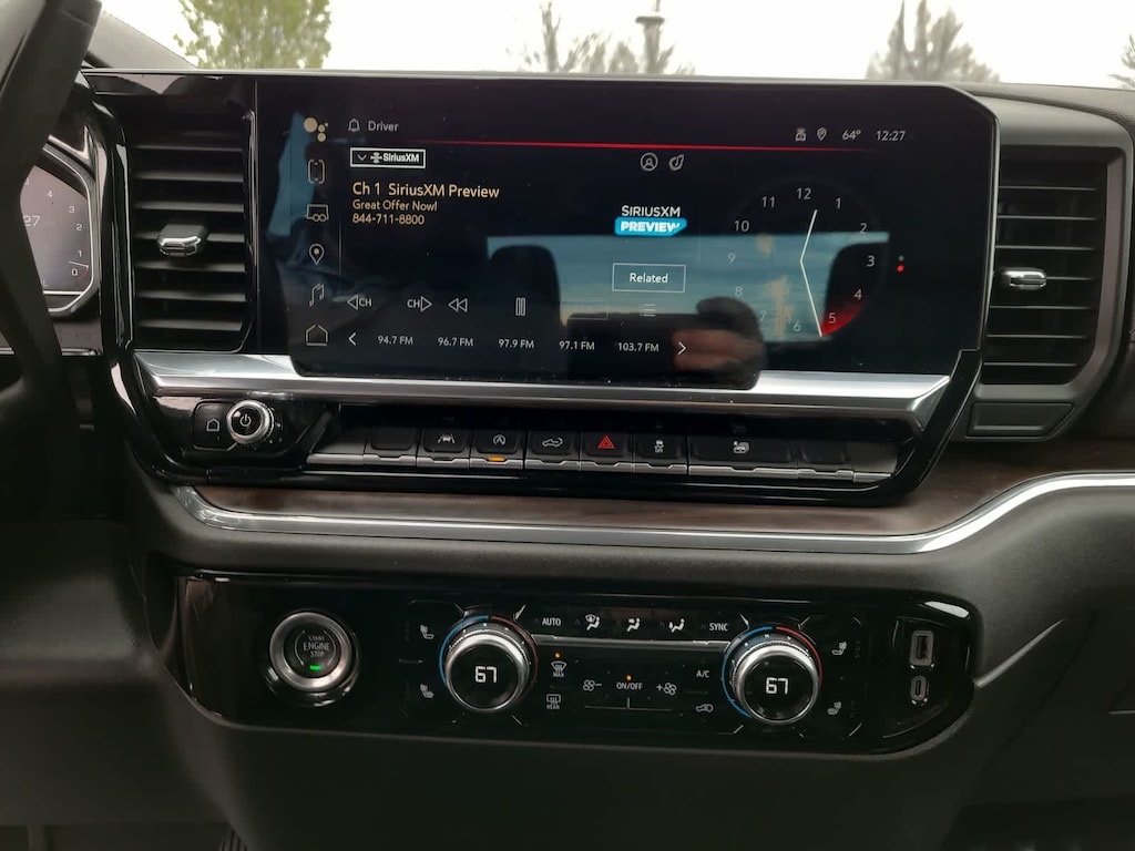 AUDIO SYSTEM, 13.4 DIAGONAL PREMIUM GMC INFOTAINMENT SYSTEM WITH GOOGLE BUILT IN APPS SUCH AS NAVIGATION AND VOICE ASSISTANCE, INCLUDES COLOR TOUCH-SCREEN, MULTI-TOUCH DISPLAY, AM/FM STEREO Bluetooth® streaming audio for music and most phones; featuring wireless Android Auto® and Apple CarPlay® capability for compatible phones (STD), ENGINE, 5.3L ECOTEC3 V8 (355 hp [265 kW] @ 5600 rpm, 383 lb-ft of torque [518 Nm] @ 4100 rpm); featuring Dynamic Fuel Management (STD), TRANSMISSION, 10-SPEED AUTOMATIC, (COLUMN SHIFTER) ELECTRONICALLY CONTROLLED with overdrive and tow/haul mode. Includes Cruise Grade Braking and Powertrain Grade Braking (STD). GMC SLT with Downpour Metallic exterior and Jet Black interior features a 8 Cylinder Engine with 355 HP at 5600 RPM*.