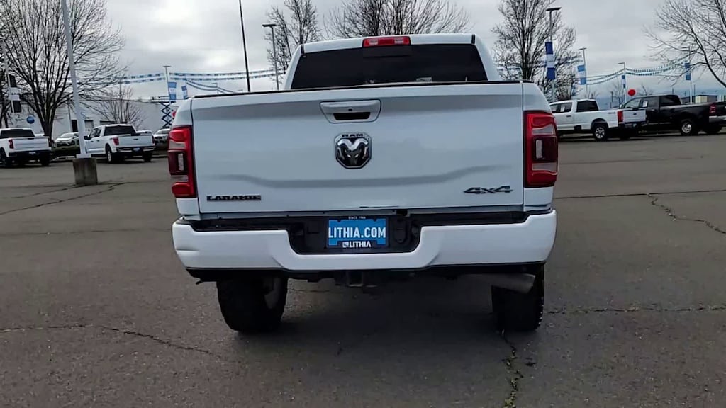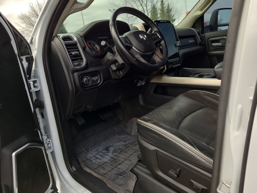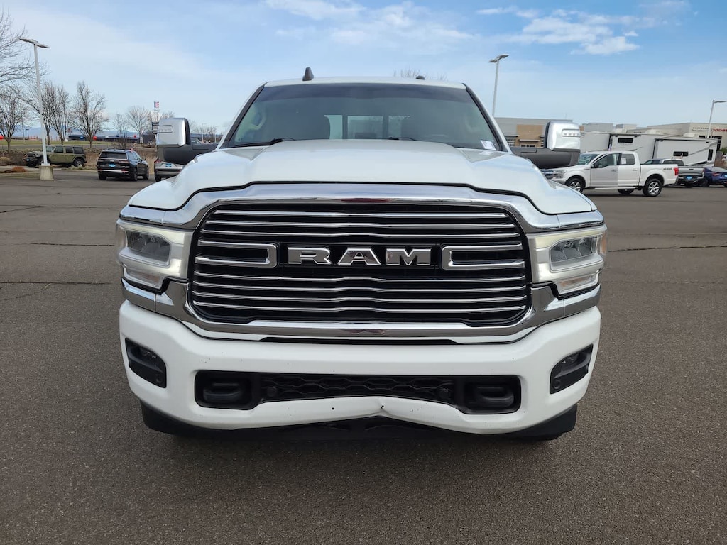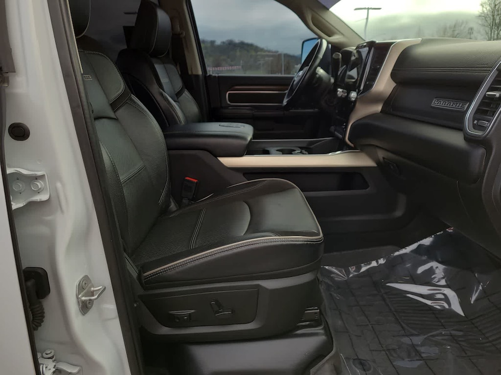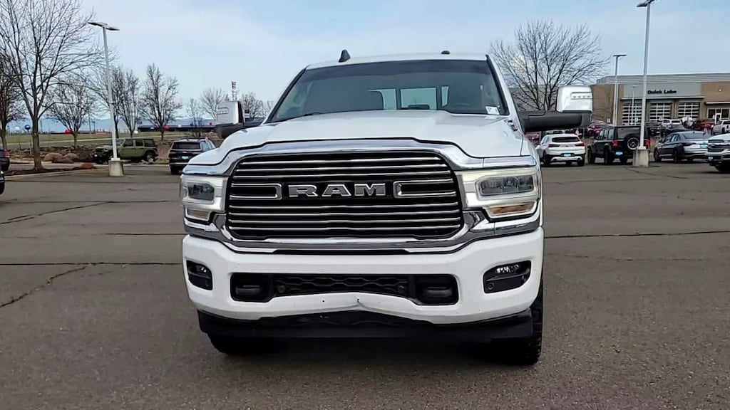 ENGINE: 6.7L I6 CUMMINS TURBO DIESEL Selective Catalytic Reduction (Urea), Dual 730 Amp Maintenance Free Batteries, Cummins Turbo Diesel Badge, Heavy Duty Engine Cooling, Supplemental Heater, 220 Amp Alternator, Tow Hooks, Diesel Exhaust Brake, Front Bumper Sight Shields, Capless Fuel Fill w/o Discriminator, LARAMIE LEVEL 1 EQUIPMENT GROUP Blind Spot & Cross Path Detection, Power Adjustable Pedals w/Memory, For Details, Visit DriveUconnect.com, For More Info, Call 800-643-2112, 12 Touchscreen Display, Auto Power-Folding Mirrors, Front LED Fog Lamps, Mirror Running Lights, Alexa Built-In, Power Adjustable Convex Aux Mirrors, Forward & Reverse Utility Lights, Disassociated Touchscreen Display, Remote Tailgate Release, 2nd Row In Floor Storage Bins, Rear Window Defroster, Rain Sensitive Windshield Wipers, Rear Power Sliding Window, GPS Navigation, Auto Dim Exterior Mirror, SiriusXM w/360L, Connected Travel & Traffic Services, LED Reflector Headlamps, Foam Bottle Insert (Door Trim Panel), Off-Road Information Pages, Selectable Tire Fill Alert, Trailer Tow Pages, HD Radio, Radio: Uconnect 5 Nav, WHEELS: 20 X 8.0 POLISHED ALUMINUM Tires: LT285/60R20E OWL On/Off Road, Center Hub, CHROME FLAT CAB-LENGTH SIDE STEPS, BLACK, LEATHER TRIMMED BUCKET SEATS Bucket Seats, High Back Seats, Folding Flat Load Floor Storage, Full Length Upgraded Floor Console, ANTI-SPIN DIFFERENTIAL REAR AXLE, TRANSMISSION: 6-SPEED AUTOMATIC (68RFE). Ram Laramie with Bright White Clearcoat exterior and Black interior features a Straight 6 Cylinder Engine with 370 HP at 2800 RPM*.